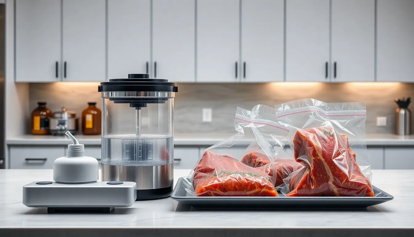 Essential equipment for sous vide includes an immersion circulator, vacuum sealer, and bags. Immersion circulators regulate water temperature with accuracy. Vacuum sealers ensure air-tight packaging, which is crucial for effective cooking. Additionally, resealable bags offer versatility for those without a vacuum sealer. Optional tools include sous vide containers and weights to ensure proper food immersion. A thermometer can further enhance temperature monitoring.